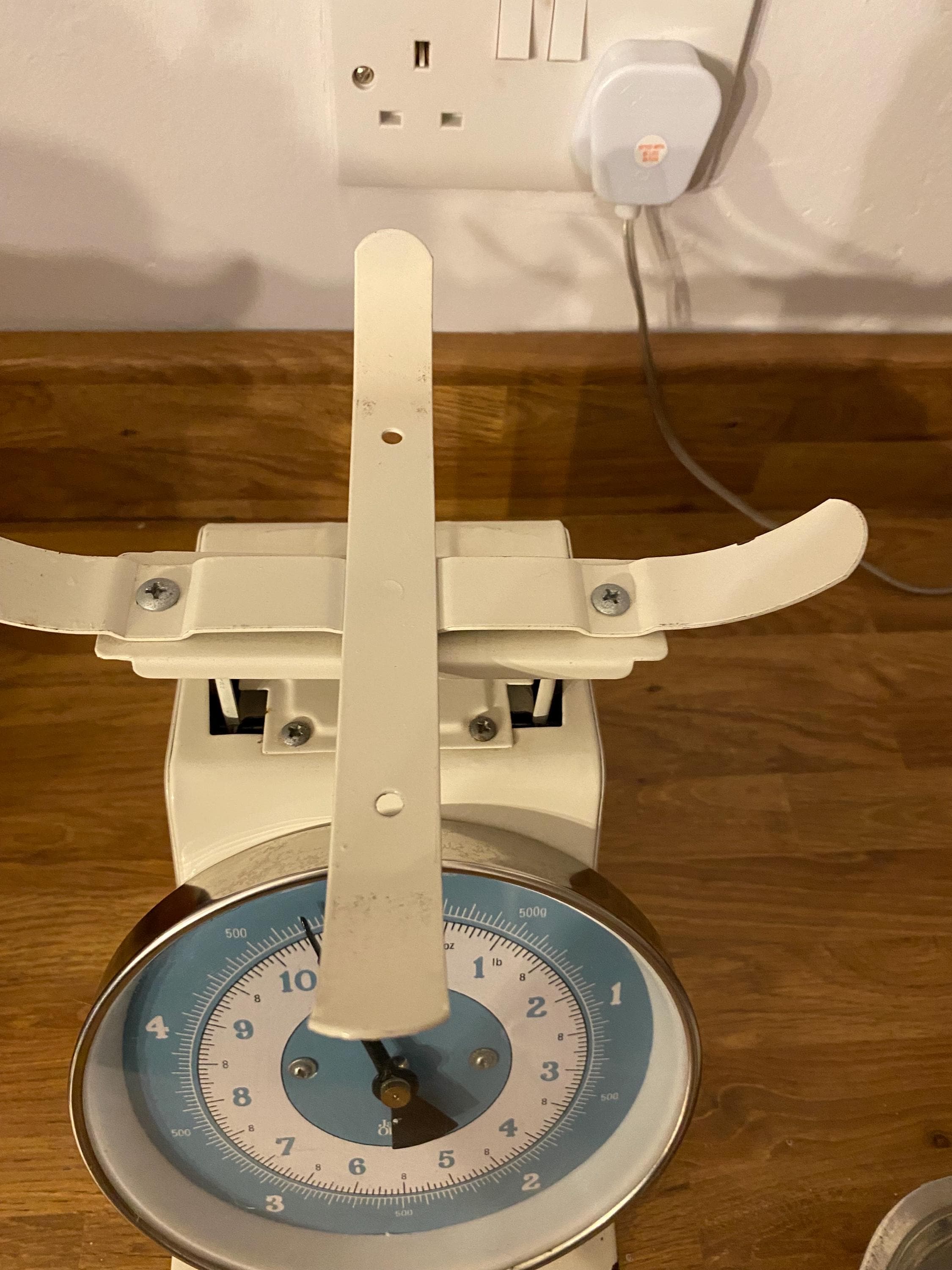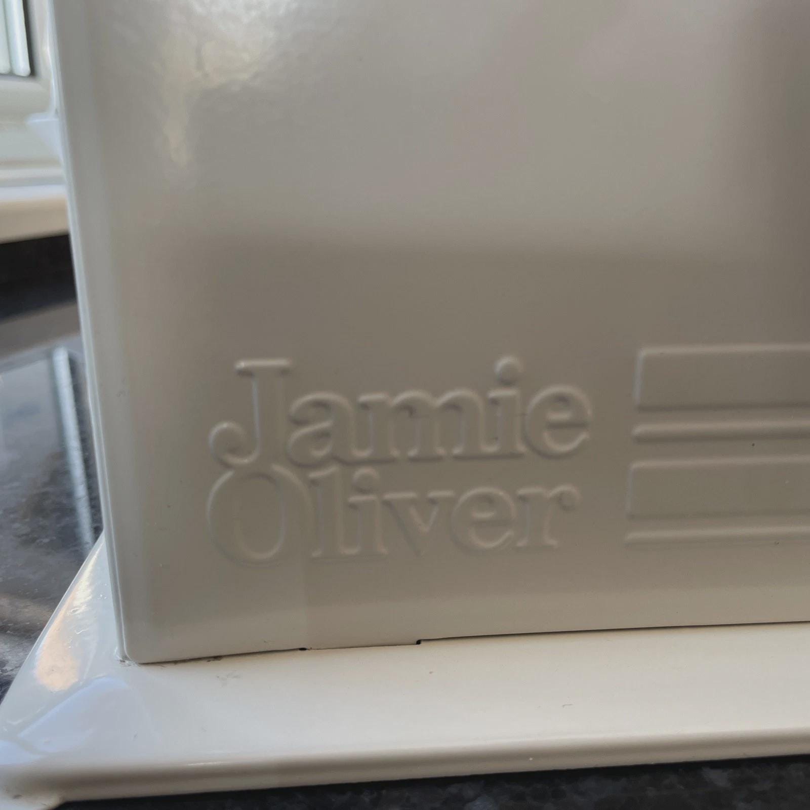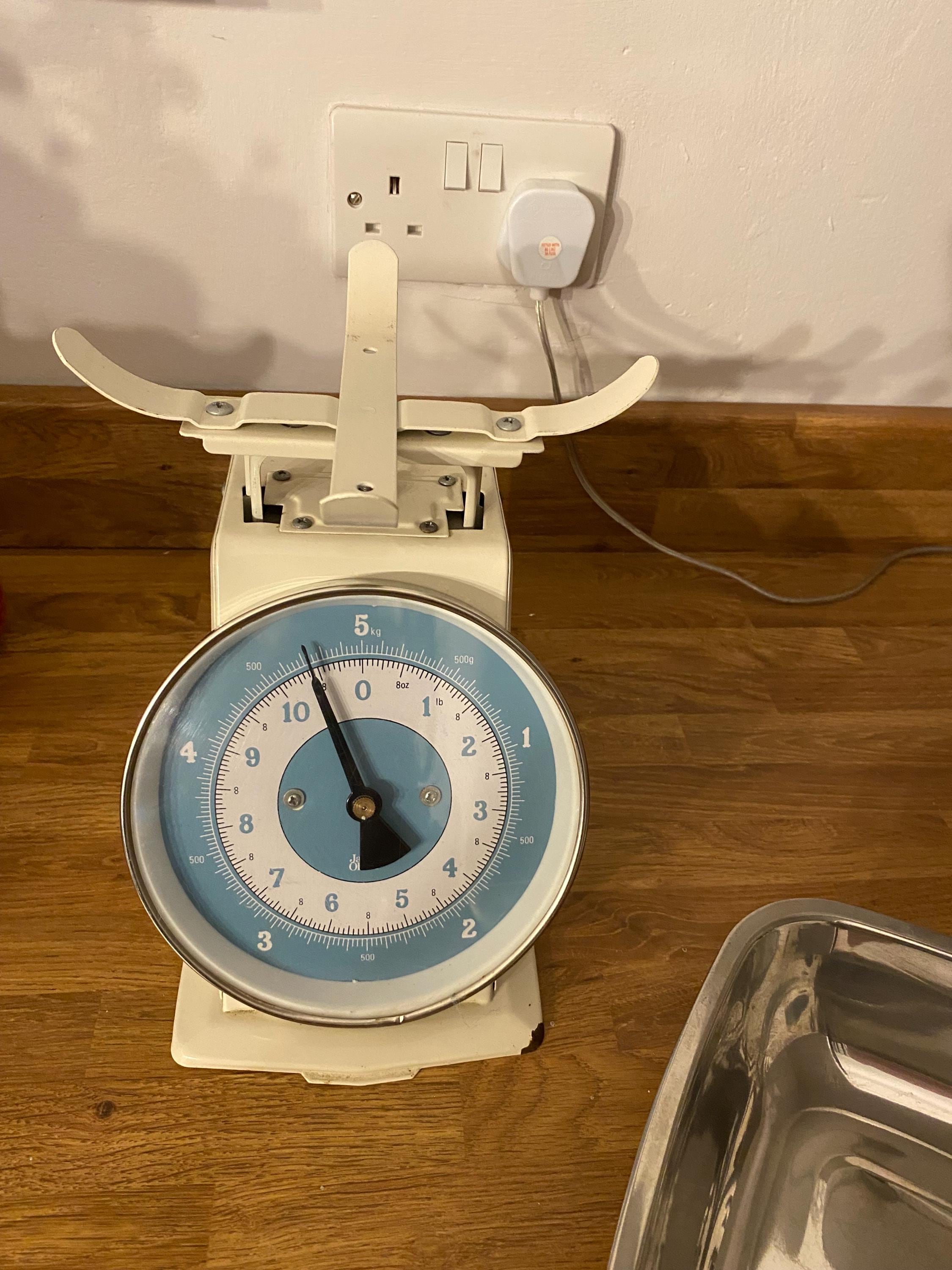 Vintage metal and enamel cream and duck egg weighing scales by Jamie Oliver.